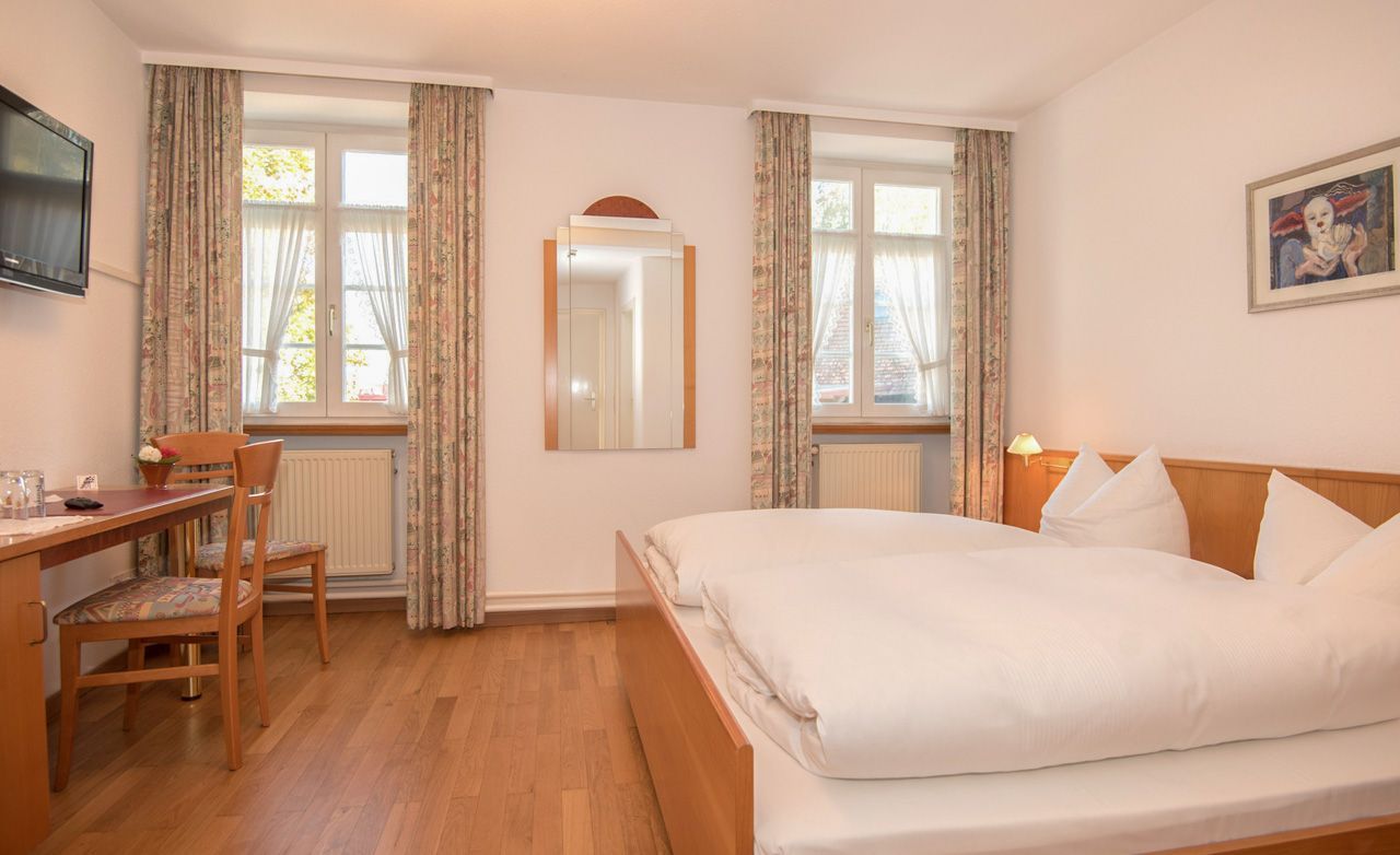 Sie genießen entspannte Wohlfühlmomente in einem hellen, freundlichen Doppelzimmer mit neuem Parkettboden, TV, kostenfreiem WLAN und Minibar – angenehm, ruhig und komfortabel.
